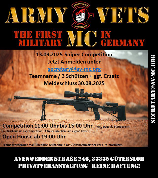 Der Army Vets MC veranstaltet am 13.09.2025 seine Sniper Party im Chapter North. Wenn auch Du Teil dieser Party sein möchtest, dann komm vorbei, Du bist herzlich Willkommen.